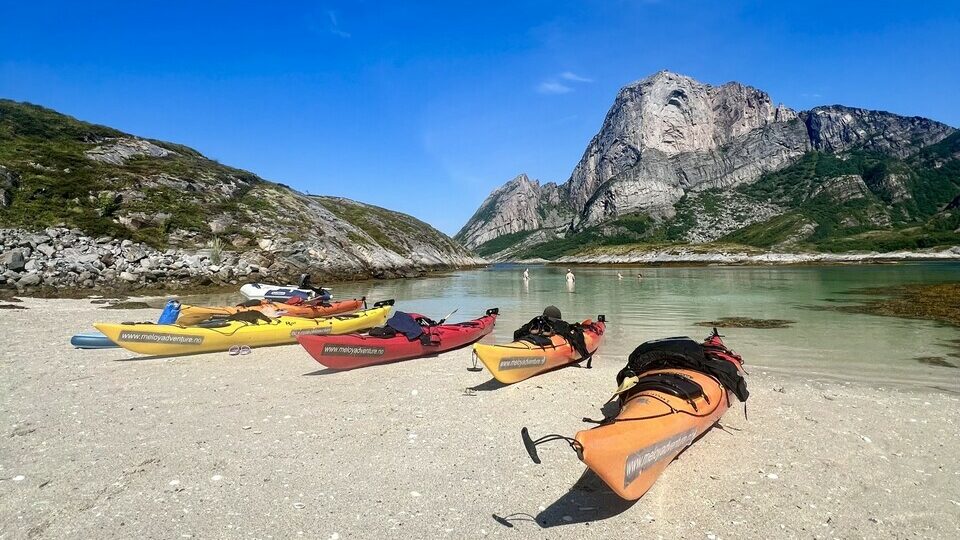 Join a guided kayak trip in the area around Rødøyløva. The tour offers a close-up experience of the island’s beaches, small bays, and steep rock formations, with Rødøyløva as an impressive backdrop.