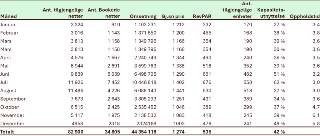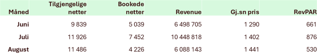 I juni var det 9 839 tilgjengelige netter på Airbnb, hvorav 5 039 bookede netter(kapasitetsutnyttelse 51%). Juli fremstår som årets klart sterkeste måned, med 11 926 tilgjengelige netter hvorav 7 452 bookede(kapasitetsutnyttelse 62%). I august var det 11 486 tilgjengelige netter hvorav 4 226 bookede netter(37%). Vi så altså en betydelig økning i tilgjengelighet fra juni til juli, mens bestillingene gikk ned til august og dermed ga lav kapasitetsutnyttelse.
