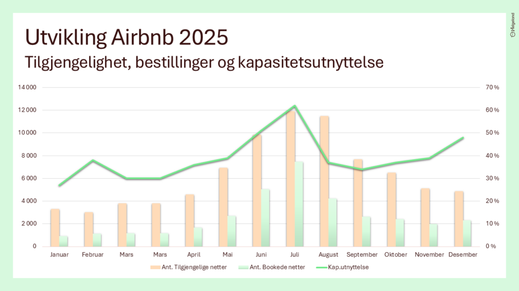 Airbnb-tallene for 2025 viser en tydelig og konsentrert sommersesong på Helgeland, der juni til august utgjør høysesongen. Aktiviteten i disse månedene dominerer både når det gjelder volum, kapasitetsutnyttelse og omsetning.