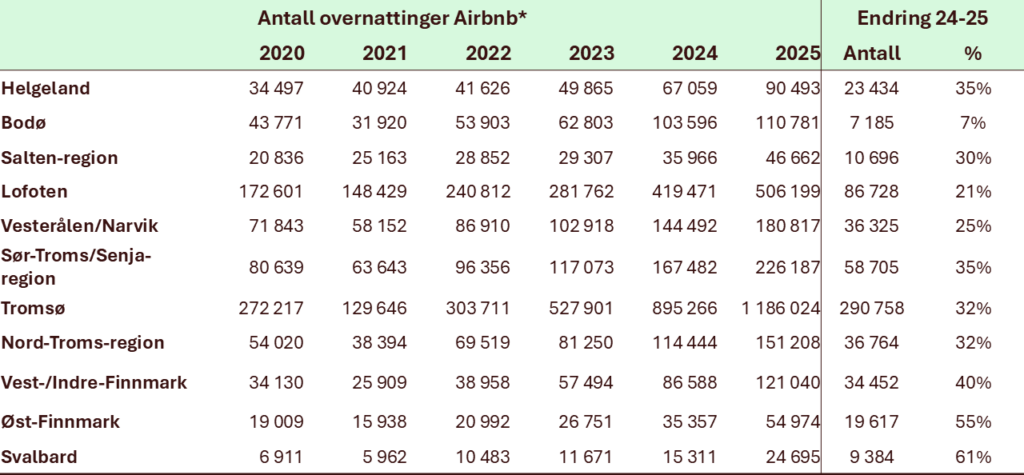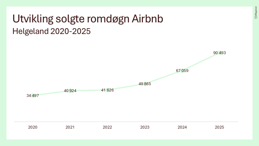 Siden 2020 har Helgeland hatt en jevn økning i antall solgte romdøgn* via Airbnb og endte i 2025 på 90 493 romdøgn, en vekst på 35%. Lofoten lå i 2025 på 506 199 romdøgn, mens Tromsø endte på 1 186 024.