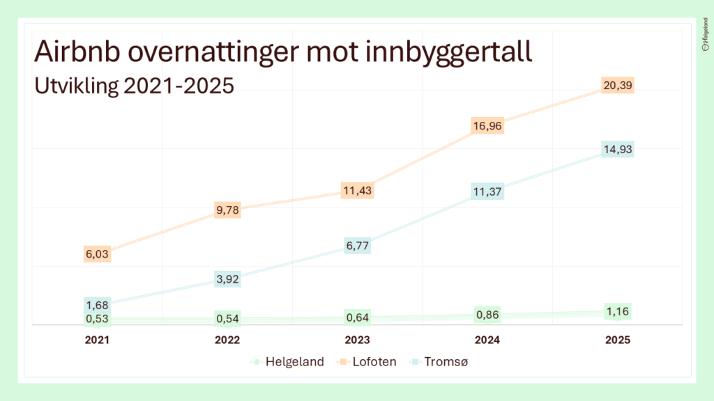 Oversikten nedenfor viser antall Airbnb-overnattinger i forhold til innbyggertallet. I 2025 hadde Helgeland 1,16 overnattinger per innbygger, mens tilsvarende tall for Tromsø var 14,93 og for Lofoten hele 20,39. Dette illustrerer tydelig at Airbnb-bruken fortsatt er på et lavt nivå i vår region.