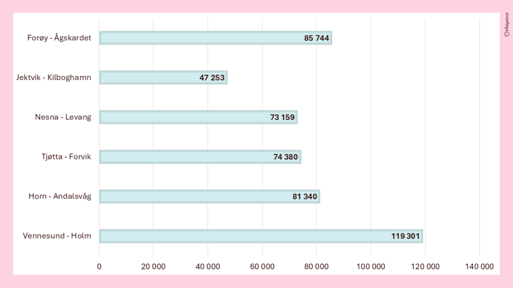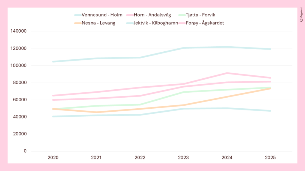 Fra 2024 til 2025 ser vi altså en økning i trafikken over de fleste fergesamband langs kystriksveien. Unntaket er Vennesund – Holm, og Forøy – Ågskardet. Dette er fergestrekningene lengst sør og lengst nord langs kystriksveien på Helgeland. Samtidig ser vi en betydelig vekst over Nesna – Levang. Dette kan antyde at mer av trafikken kommer inn til Kystriksveien via E6. Dette understøttes også av trafikktallene vi har for tellinger langs viktige veistrekninger i «Sommertrafikken på Helgeland«.