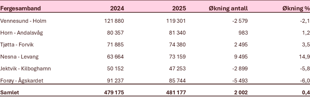 I Statens vegvesens ferjestatistikk baserer “tellinger” seg på registreringer i AutoPASS‑billetteringen, der passeringer måles etter takstgrupper og i hovedsak gjelder ulike typer kjøretøy, ikke personer. Statistikken hentes fortløpende fra det nasjonale billetteringssystemet og publiseres som takst‑ og kjøretøybaserte volumer i Ferjedatabanken. Under har vi hentet ut viktig innsikt fra denne statistikkbanken til å belyse trafikkutviklingen over fergesambandene langs kystriksveien.