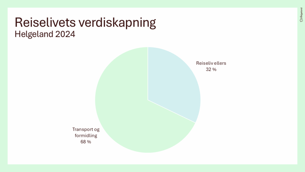 Tall fra 2023 viser at 55 % av verdiskapingen på Helgeland kommer fra transport, 27 % fra serveringsvirksomhet, 12 % fra overnatting, 5 % fra kultur og underholdning, og 1 % fra formidling.