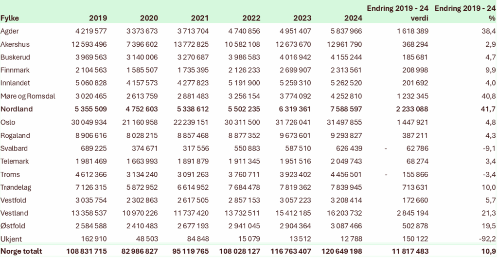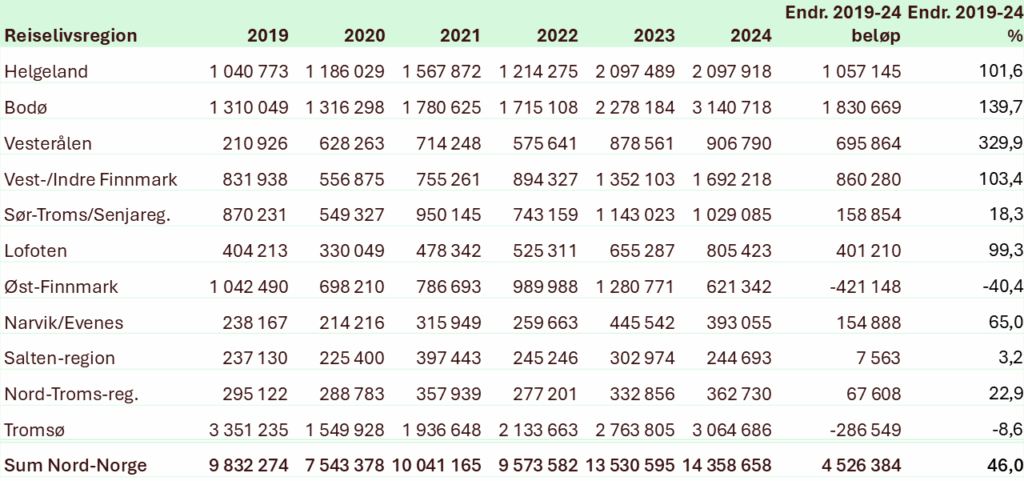 På landsbasis har reiselivets verdiskaping økt med 10,9 % siden 2019, tilsvarende 11,8 milliarder kroner. I samme periode har Nordland hatt en markant vekst på 41,7 %, noe som utgjør 2,23 milliarder kroner. Som tabellen ovenfor viste har verdiskapningen på Helgeland økt med over 100% i samme periode med en viss utflating fra 2023-2024.