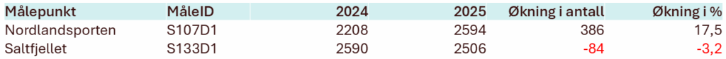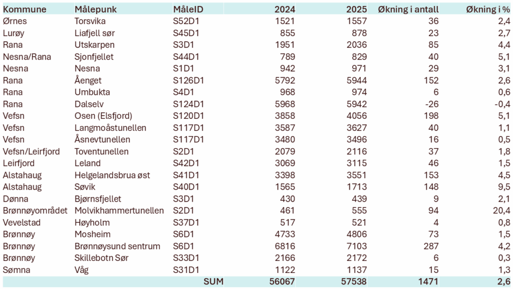 - Vefsn: Ved Osen (Elsfjord) ble det registrert en betydelig økning på 198 daglige passeringer (+5,1 %).